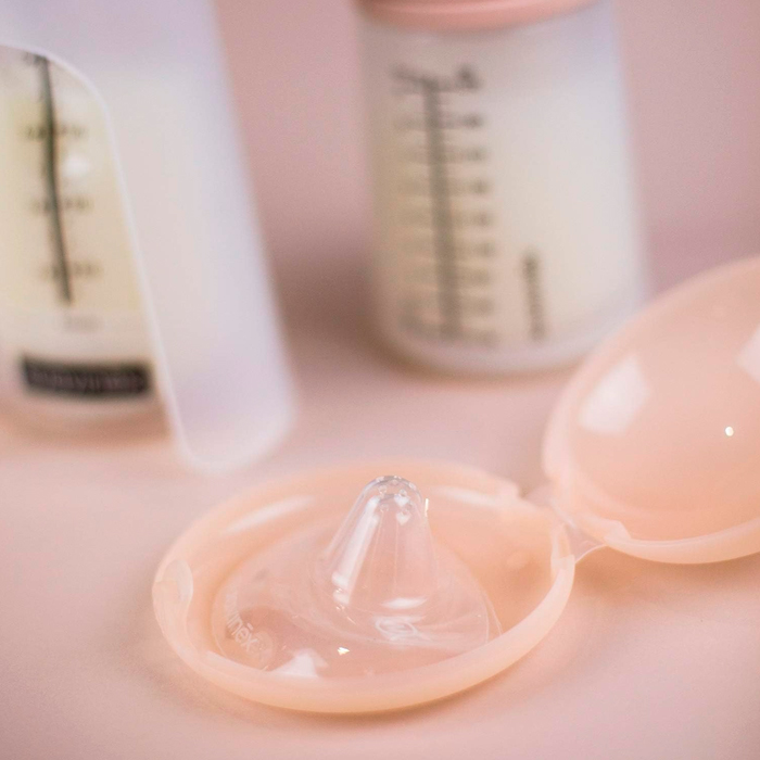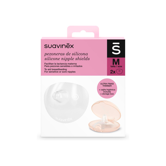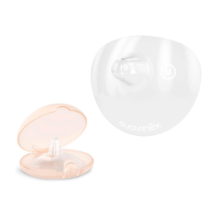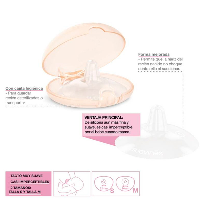 Las Pezoneras Suavinex de Silicona Talla M están diseñadas con silicona fina e inodora que protegen el pecho sin molestar en absoluto al bebé, con un de tacto muy suave y casi imperceptibles, que se adaptan a cualquier tamaño de pecho. Su forma mejorada permite que la nariz del recién nacido no choque contra ella al succionar.