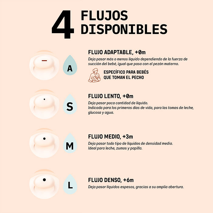 Son la opción ideal para bebés a partir de los 6 meses que necesitan un flujo más denso para líquidos más espesos.