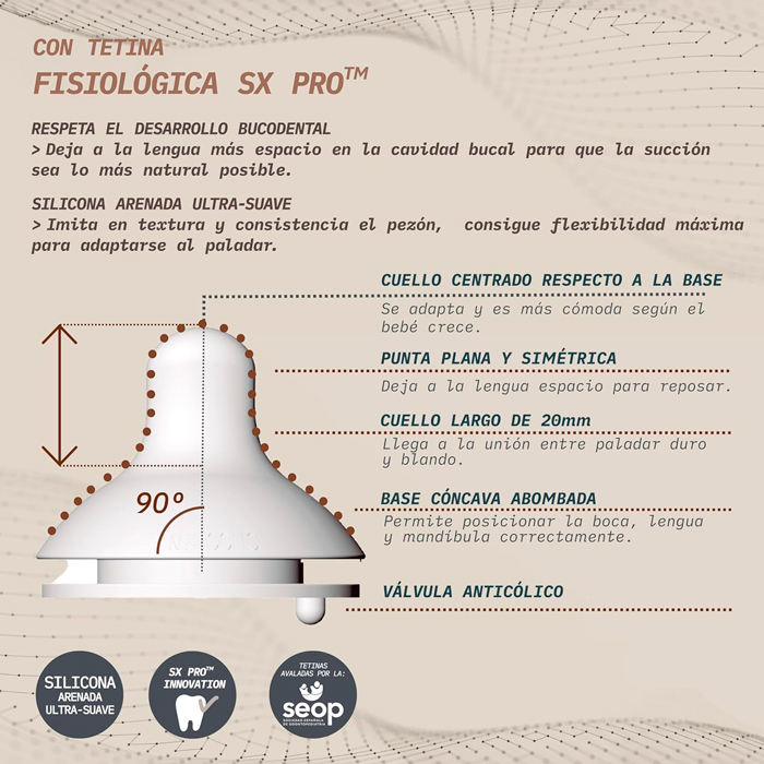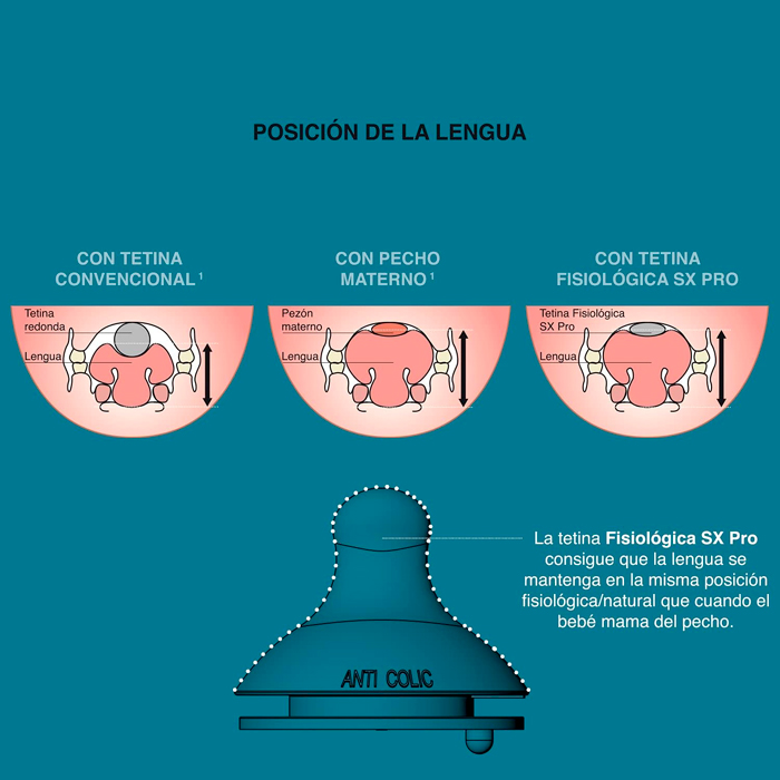 La tetina Fisiológica SX Pro de Suavinex consigue que la lengua del bebé se mantenga en la misma posición que cuando el bebé mama del pecho. Ha sido diseñada teniendo en cuenta las particularidades bucodentales del bebé, donde el maxilar y la mandíbula están en pleno desarrollo.