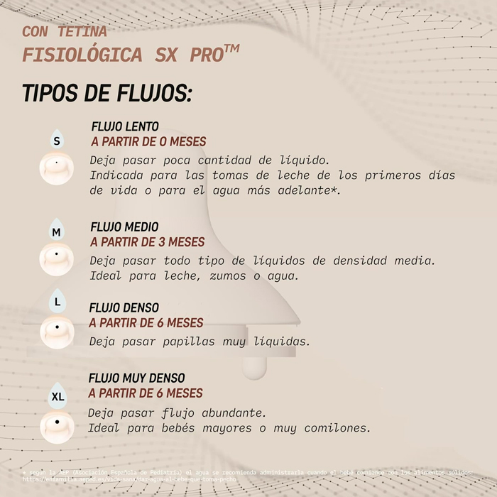 El flujo denso de la tetina fisiologica SX Pro deja pasar papillas muy líquideas, ideal para los peques más glotones.