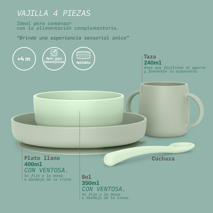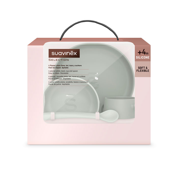 Vajilla de Silicona Colour Essence Rosa Suavinex está indicada para bebés a partir de los 4 meses y está compuesto por: