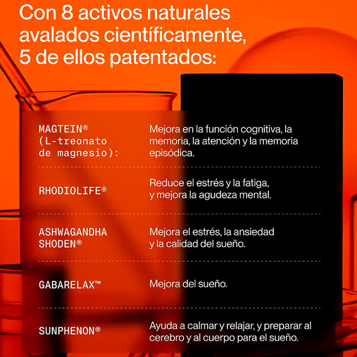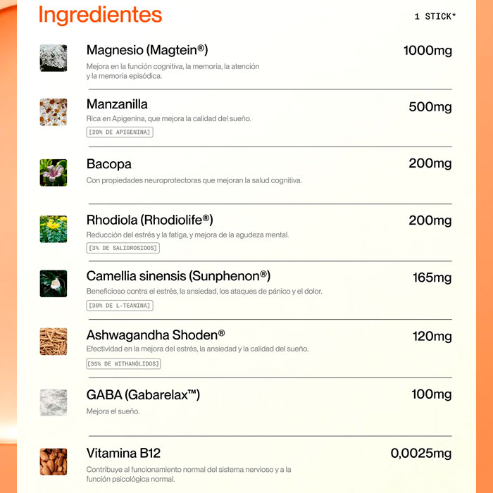Agua, zumo de grosella, sirope de agave, humectante (glicerina), Magtein® treonato de magnesio, extracto seco de manzanilla (Matricaria recutita, parte aérea, 20% apigenina), estabilizante (ciclodextrina), aromas, extracto seco de bacopa (Bacopa monnieri, hojas y tallos, 10:1), Rhodiolife® extracto seco de rhodiola (Rhodiola Rosea, raíz, 3 % salidrosidos), Sunphenon® extracto de té verde (Camellia sinensis, hojas, 30% L-teanina), Shoden® extracto seco de ashwagandha (Withania somnifera, raíz, 35% withanólidos), Gabarelax TM® (ácido gamma aminobutírico (GABA)), estabilizante (celulosa microcristalina), espesante (goma xantana), conservantes (sorbato de potasio, benzoato de sodio), acidulante (ácido cítrico), edulcorante (glucósidos de esteviol procedentes de estevia), cianocobalamina (vitamina B12).