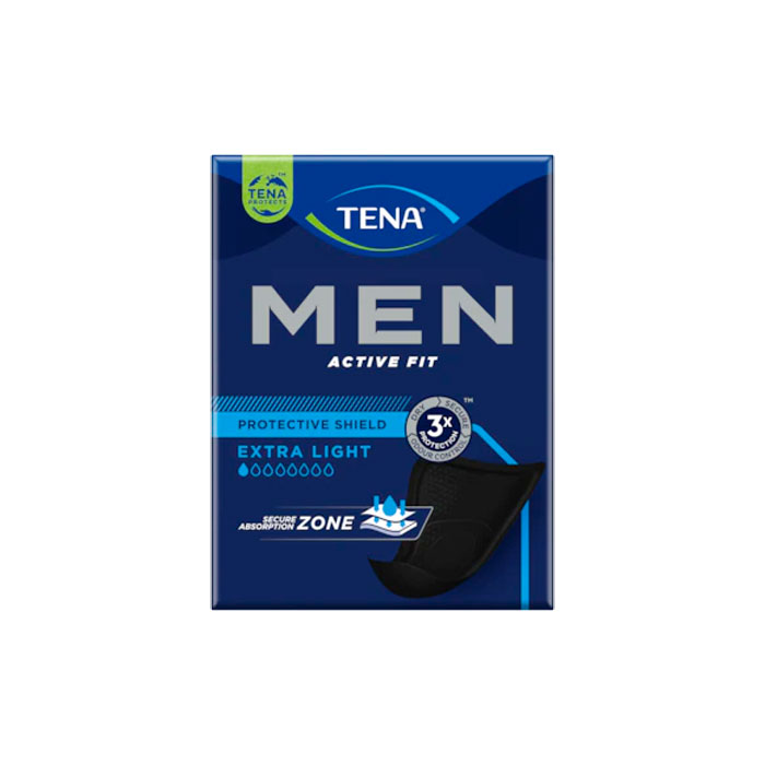 Tena Men Escudo Protector Extra Light es un protector, muy ligero, fino y discreto, con un diseño masculino en color negro y un núcleo absorbente que protege del goteo leve, las pequeñas pérdidas de orina y el olor.