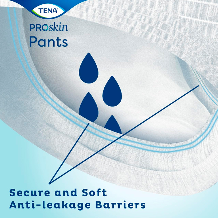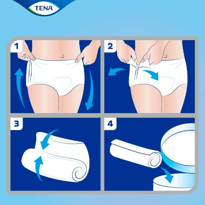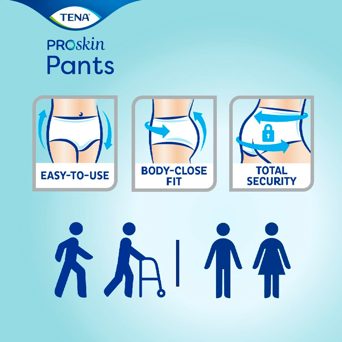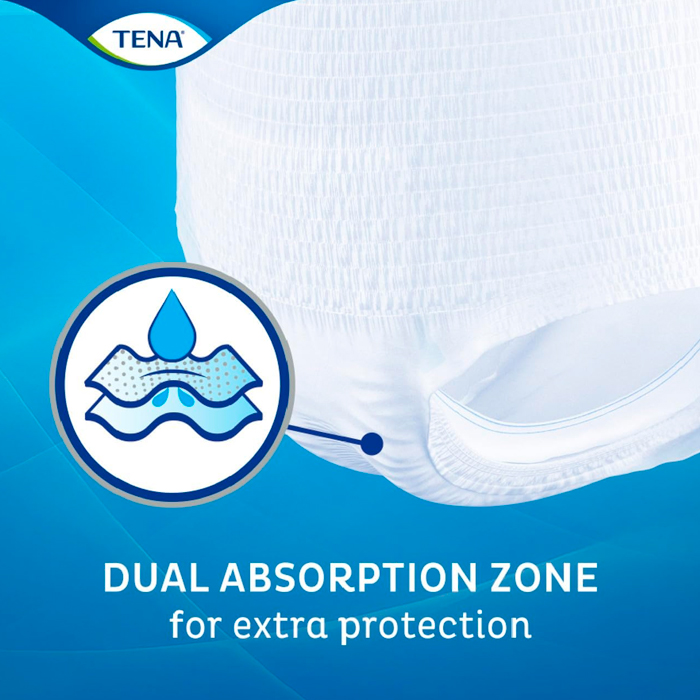Tena Pants Super es una ropa interior absorbente cómoda y desechable de color blanco para hombres y mujeres que sufren incontinencia y que se adapta al cuerpo como la ropa interior normal.