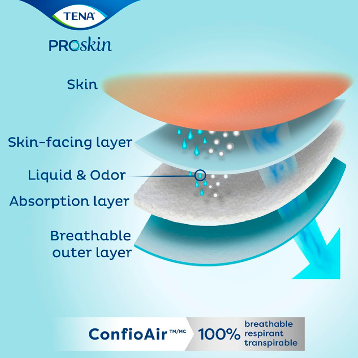 Está fabricada con materiales transpirables de tacto textil que se adaptan al contorno del cuerpo para ofrecer máxima comodidad. A diferencia de los pañales para adulto estándar, Tena Pants Super tiene un núcleo de gran absorción que atrapa rápidamente el líquido de manera eficaz y ofrece protección total.