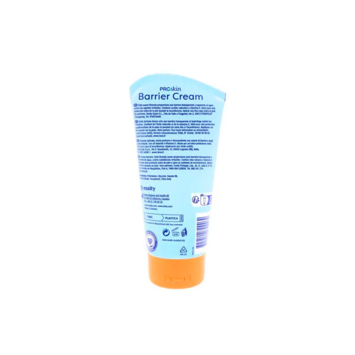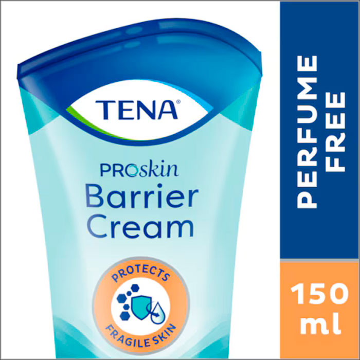 TENA ProSkin Barrier Cream es una pomada transparente y repelente al agua, especialmente diseñada para prevenir y proteger la piel frágil y sensible que muestra los primeros signos de enrojecimiento e irritación causada por la incontinencia. Ideal para el cuidado de la piel de personas mayores, esta crema suave está formulada con una combinación de ingredientes nutritivos y protectores.