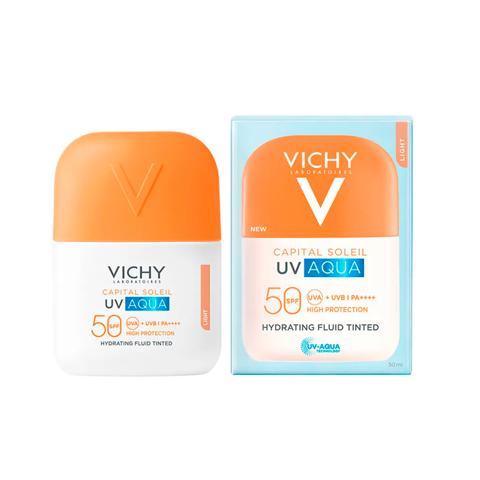 Vichy Capital Soleil UV Aqua Spf50 Tono Claro con color es el fotoprotector perfeccionador de última generación, diseñado para pieles claras que buscan una protección muy alta combinada con un acabado luminoso y uniforme.