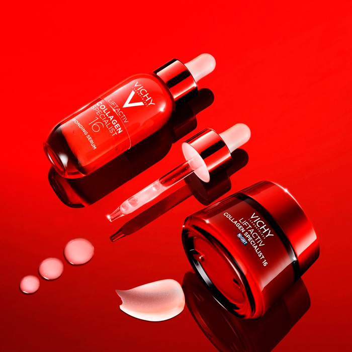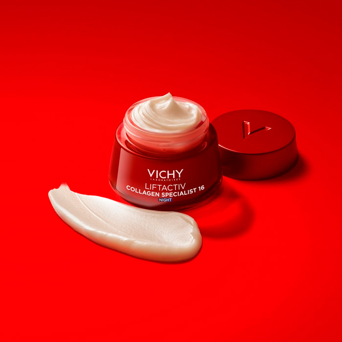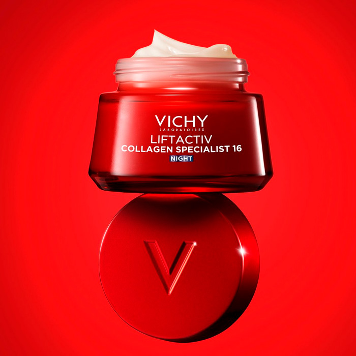 Vichy Liftactiv Collagen Specialist 16 Crema de Noche es la primera crema de noche de Laboratorios Vichy con tecnología Co-Bonding, diseñada para potenciar el colágeno y corregir 16 signos de la edad mientras duermes.