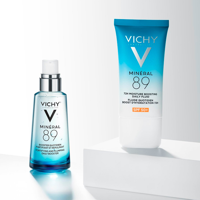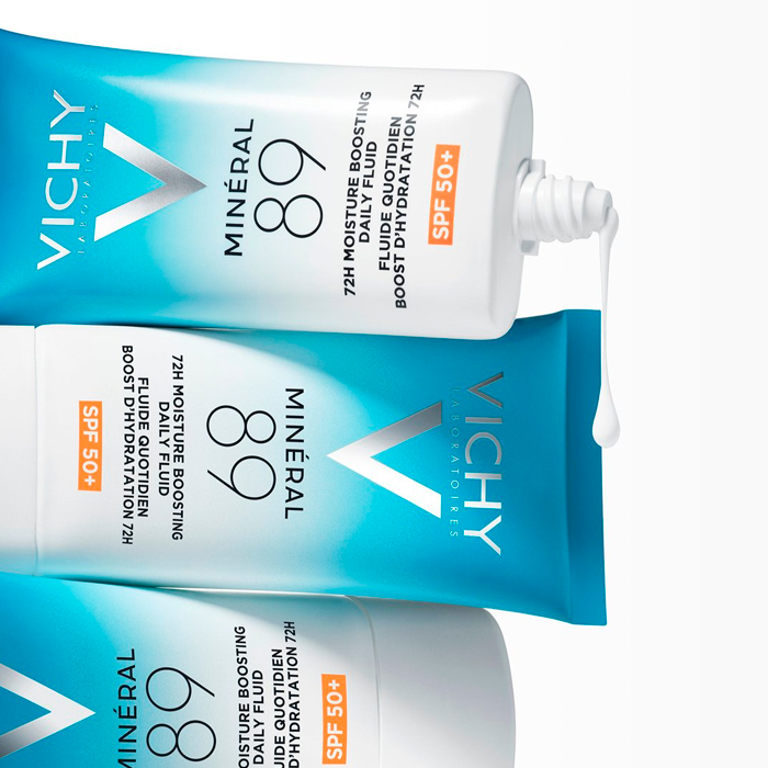 Aplicar de 2 a 3 gotas de Vichy Minéral 89 Fluido Diario Boost de Hidratación 72h Spf50+ 50ml en el rostro todas las mañanas. Agitar bien antes de usar.