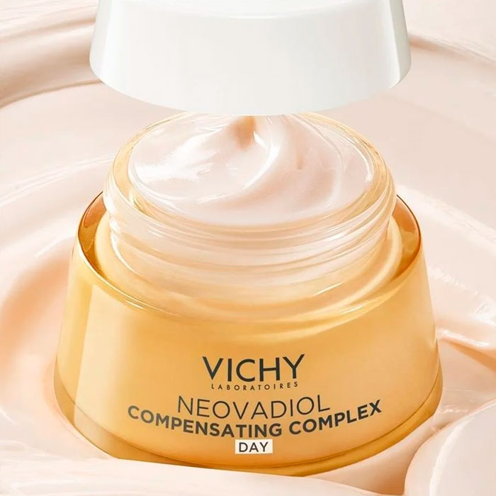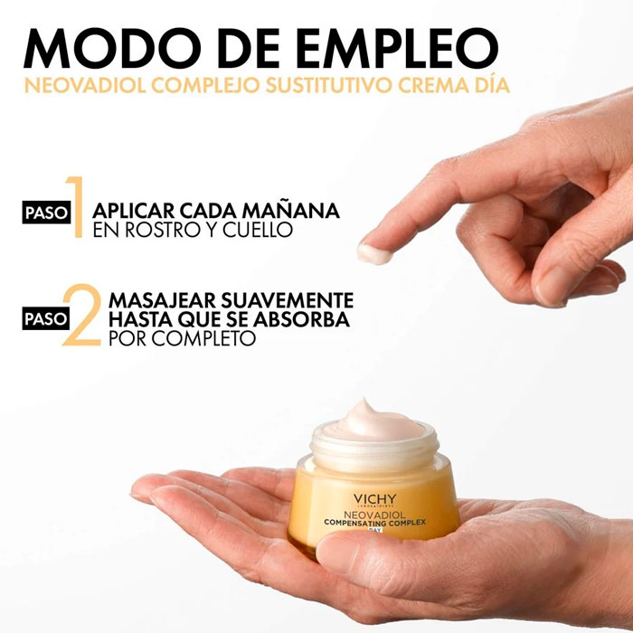 Aplicar Vichy Neovadiol Complejo Sustitutivo Crema Redensificante y Reafirmante Día Piel Seca 50ml en rostro, mandíbula y cuello, evitando el contorno de los ojos, después de MENO 5 BI-SERUM.