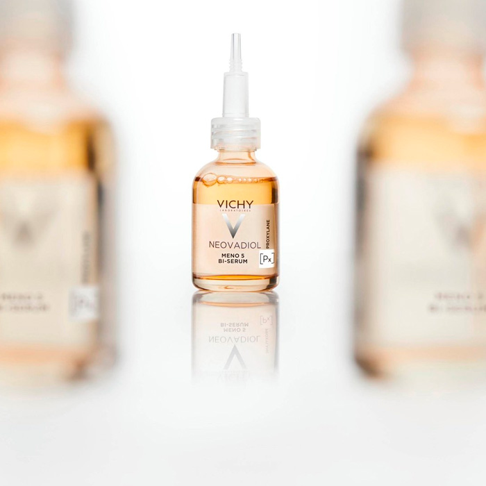 Vichy Neovadiol Meno 5 Bi-serum Perimenopausia y Postmenopausia ha sido desarrollado para cubrir las necesidades de la mujer durante la peri y en la post-menopausia que corrige los volúmenes, mejora la firmeza y ayuda a homogeneizar el tono y reducir las manchas.