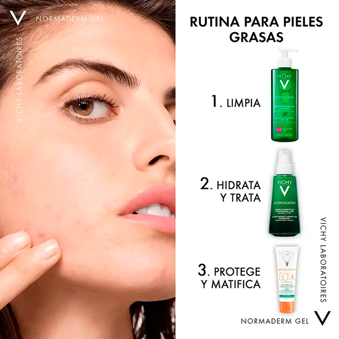 Vichy Normaderm Gel Purificante Limpieza Profunda es un gel espumoso diseñado para la limpieza facial diaria de pieles grasas y con tendencia a imperfecciones.
