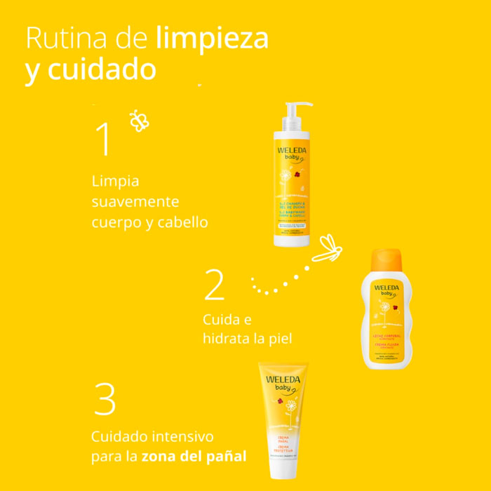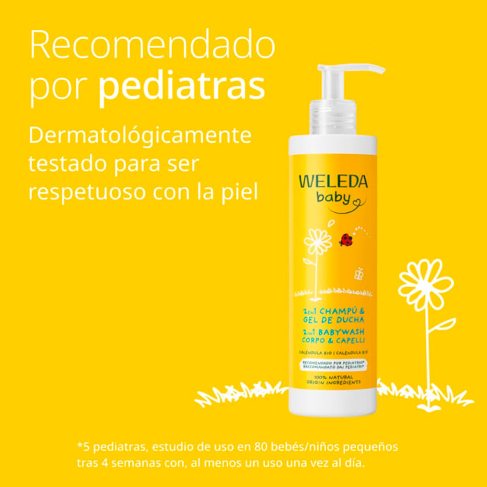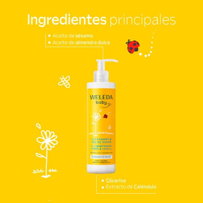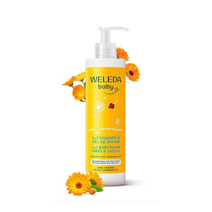 El Champú y Gel de Ducha de Caléndula de Weleda es el cuidado de higiene 2 en 1 esencial para los más pequeños, diseñado para limpiar con extrema delicadeza la piel y el cabello desde el primer día de vida.