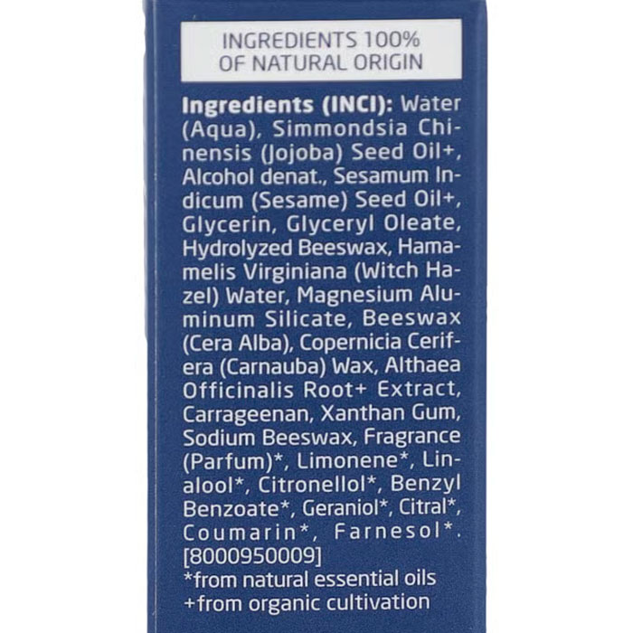 Agua, Aceite de jojoba, Alcohol, Aceite de sésamo, Glicerina, Gliceril oleato, Cera de abeja hidrolizada, Agua destilada de hamamelis, Arcilla, Cera de abeja blanca, Cera de carnauba, Raíz de malvavisco, Carragenato, Goma de xantano (emulgente y estabilizador natural), Jabón de cera de abeja, Aceites esenciales naturales, Limoneno, Linalool, Bencil benzoato, Citral, Cumarina Farnesol
