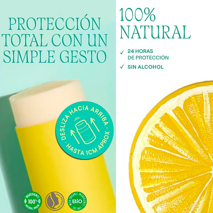 El formato stick facilita una aplicación fácil y rápida, deslizándose suavemente sobre la piel para dejar una sensación de frescor y un agradable aroma cítrico que te acompañará durante todo el día.